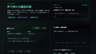 これは何?現場作業の報告を「話すだけ」で完了させる日報デモアプリです。音声入力、AI風の自動整形、写真の自動分類、ワンタップのステータス送信を組み合わせ、「5分かかっていた日報を30秒に」を目指しています。以下URL(Vercel)にデモア...