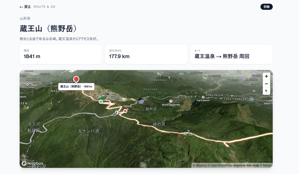 登山の計画を立てるとき、「自分の住んでいる地域から、レベルに合った山を距離感つきで知りたい」「ルートの雰囲気を航空写真で見ながら確認したい」と思うことがありました。そこで 居住地・レベル・距離 からおすすめの山を提案し、詳細では 航空写真 + 3D地形 + GPXルート を表示できるWebアプリを作りました。